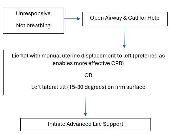 Aortocaval compression can be relieved by manual left uterine displacement or left lateral tilt (although supporting data are derived from non-cardiac arrest and simulation studies).