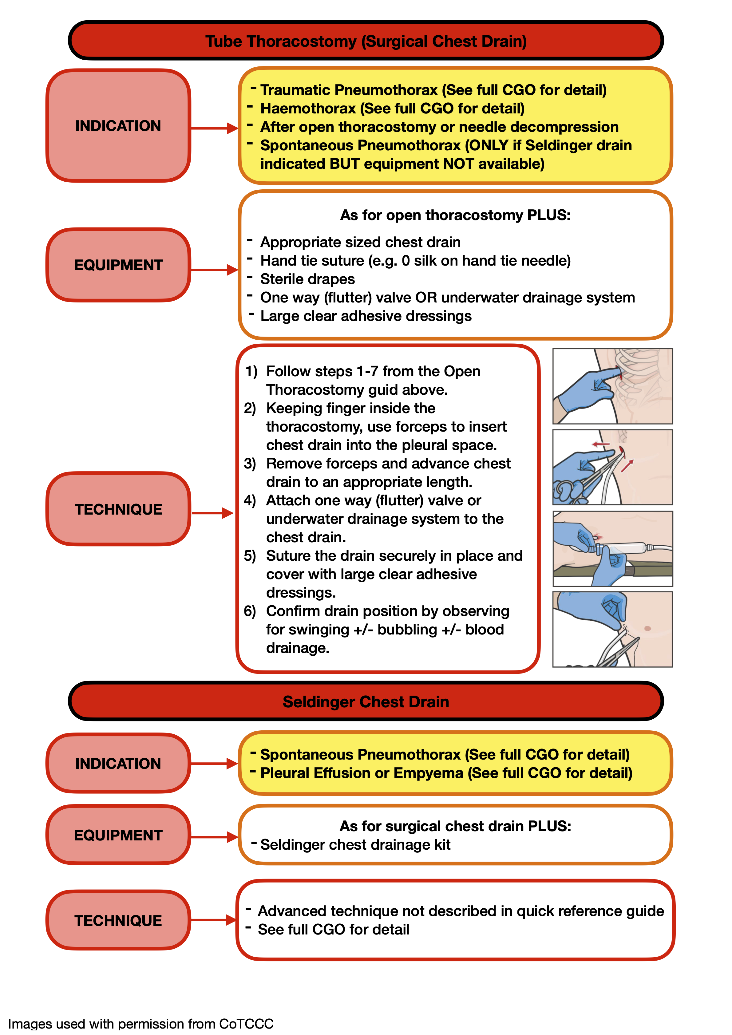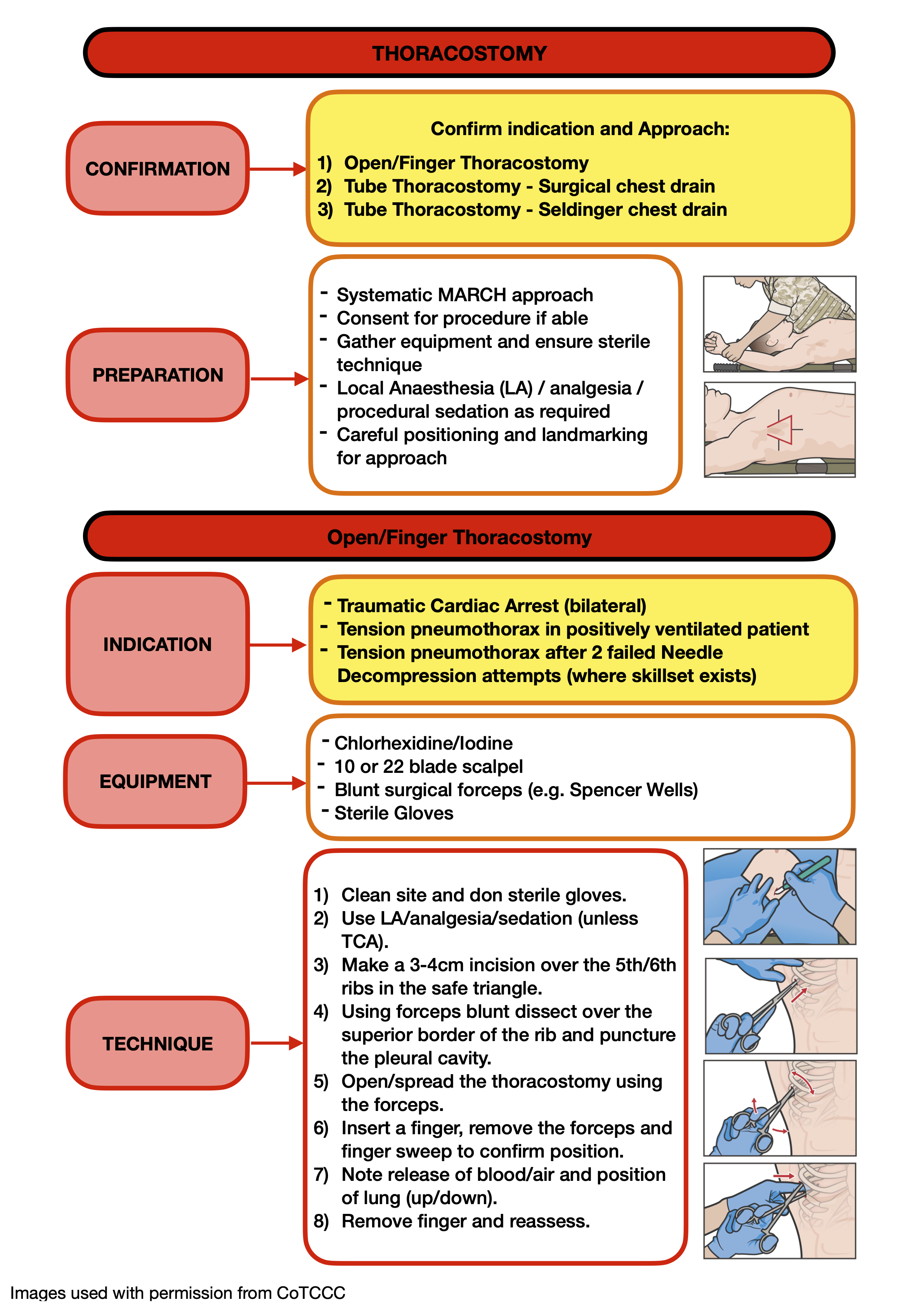 Consider progressing to insertion of a surgical chest drain if the patient experiences repeated episodes of tension pneumothorax requiring re-fingering of the thoracostomy. A drain may also be inserted in preparation for evacuation if it is thought that monitoring or accessing the thoracostomy site may be difficult in transit.