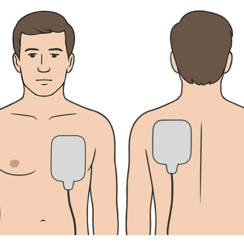 Pads may be placed either in the anteroposterior position (as illustrated) or in the conventional anterolateral position that would normally be used for defibrillation. Limited evidence suggests that pacing capture is more likely to be achieved with anteroposterior pad positioning so this is recommended as the initial approach if possible.