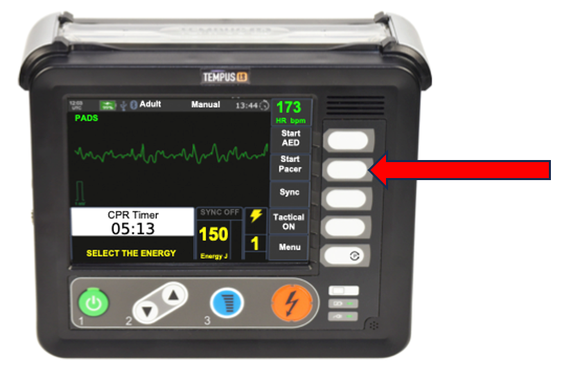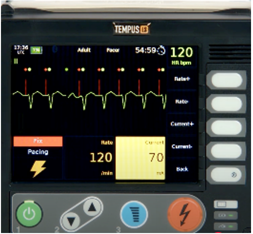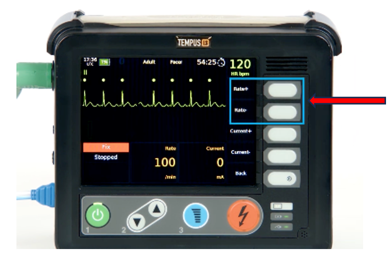 Once the patient is connected to the monitor, the pacing control buttons will be enabled. Increase the rate to an appropriate level (typically 70 bpm for an adult patient).