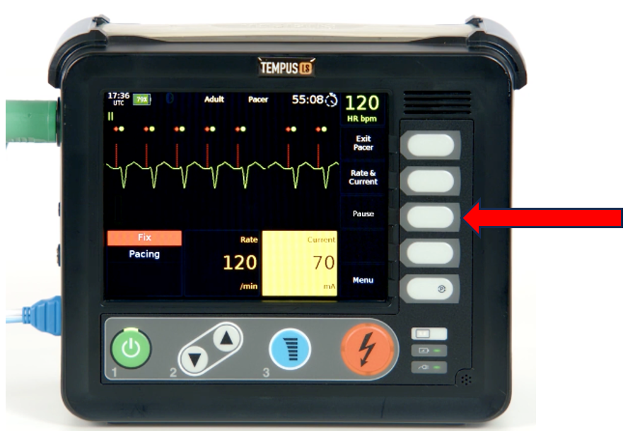 To pause pacing go back to the pacing menu and select the pause button as shown. If "exit pacer" is selected then the device will automatically cease pacing.